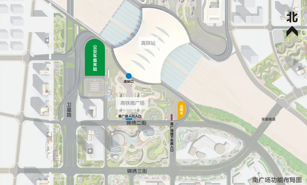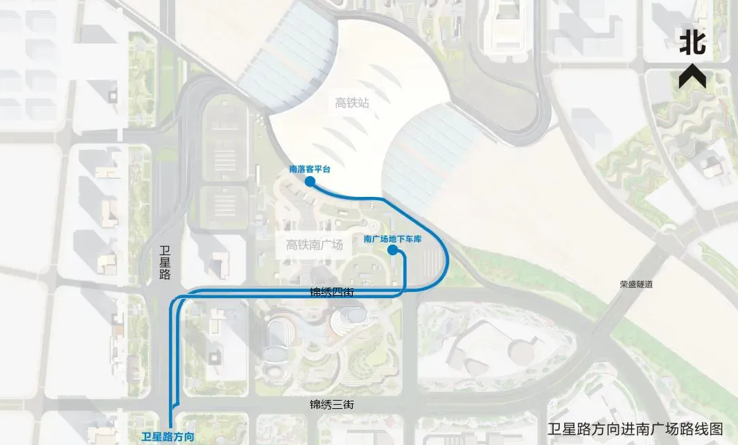 衛(wèi)星路方向的車輛可以從衛(wèi)星路匝道上橋直接進入南落客平臺送客,有停車需求的車輛經(jīng)過錦繡四街,在與高鐵南三路交叉路口左轉進入南廣場地下車庫。