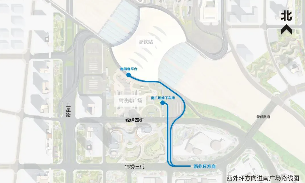 西外環(huán)方向的車輛可以穿過榮盛隧道隧道,出隧道后右轉駛入南落客平臺直接送客,有停車需求的車輛出隧道右轉經(jīng)過高鐵南三路進入南廣場地下車庫。