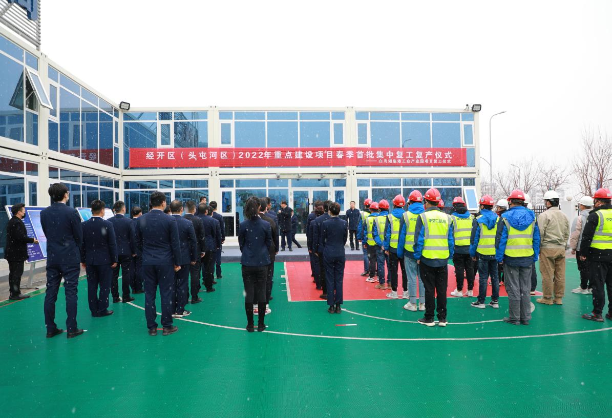 經(jīng)開區(qū)(頭區(qū))管委會(huì)副主任、副區(qū)長(zhǎng)任宏偉,經(jīng)開區(qū)(頭區(qū))工業(yè)局副局長(zhǎng)秦江峰和高鐵開發(fā)集團(tuán)黨委書記、董事長(zhǎng)畢忠華、高鐵開發(fā)集團(tuán)副總經(jīng)理、安全總監(jiān)魏文東參加復(fù)工儀式。儀式上,畢忠華同志對(duì)白鳥湖臨港產(chǎn)業(yè)園2021年項(xiàng)目建設(shè)情況進(jìn)行了肯定,并就2022年各項(xiàng)工作進(jìn)行了部署,他指出,“白鳥湖臨港產(chǎn)業(yè)園項(xiàng)目要嚴(yán)格按照規(guī)劃,加快建設(shè)進(jìn)度,著力保障施工安全,全力以赴,高標(biāo)推進(jìn)各項(xiàng)工作落地落實(shí)”;經(jīng)開區(qū)(頭區(qū))管委會(huì)副主任、副區(qū)長(zhǎng)任宏偉代表區(qū)委、管委會(huì)(區(qū)政府)做了復(fù)工指示,他強(qiáng)調(diào),“高鐵開發(fā)集團(tuán)要將白鳥湖臨港產(chǎn)業(yè)園項(xiàng)目建設(shè)成為一個(gè)優(yōu)質(zhì)工程、陽(yáng)光工程、廉潔工程、民心工程”,并宣布項(xiàng)目復(fù)工。