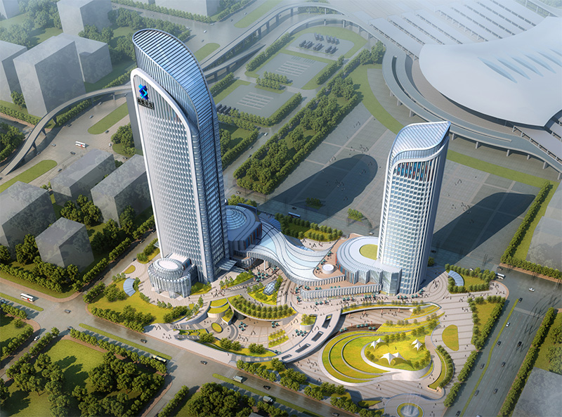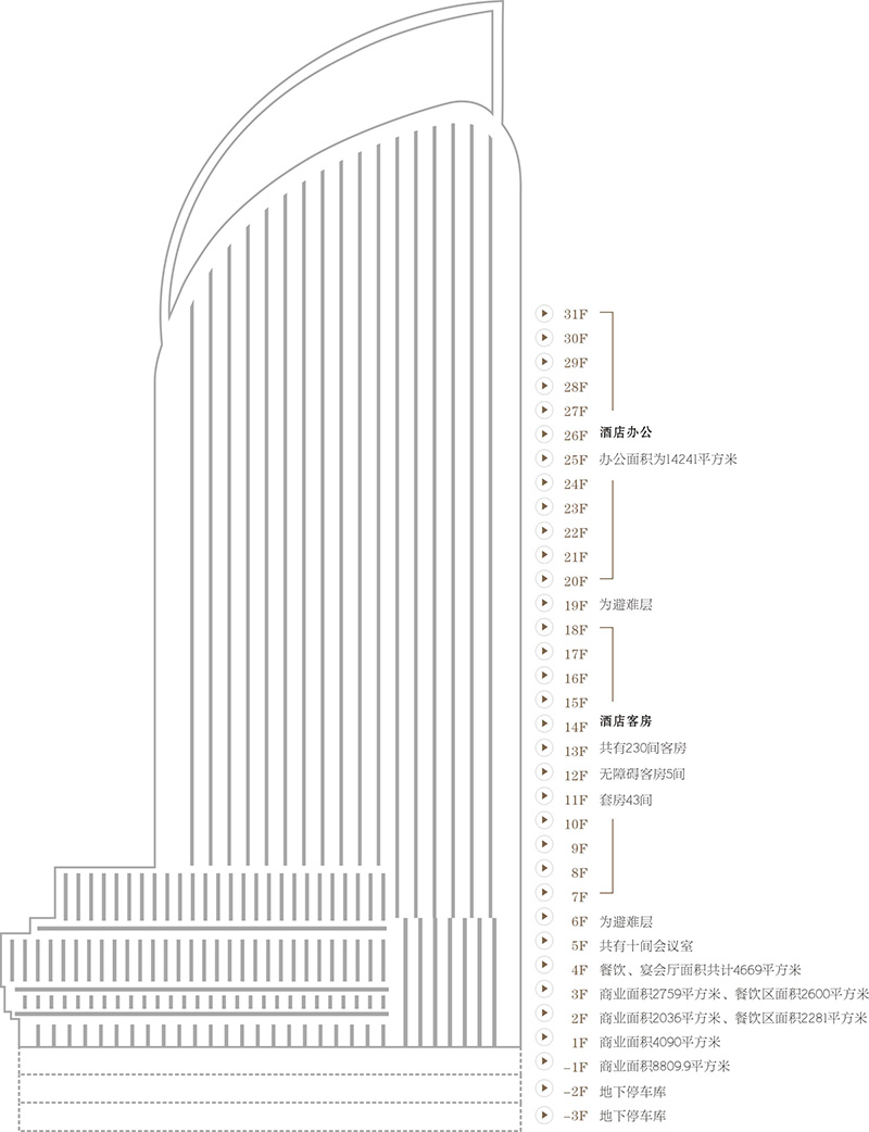 總建筑面積140417.8㎡,地下一層商業(yè)、服務(wù)、餐飲、配套辦公面積10635.5㎡,夾層及地上商業(yè)、辦公、酒店、面積77220㎡,地下一、二、三層提供車(chē)位902個(gè),建筑標(biāo)高130米,共三十四層。