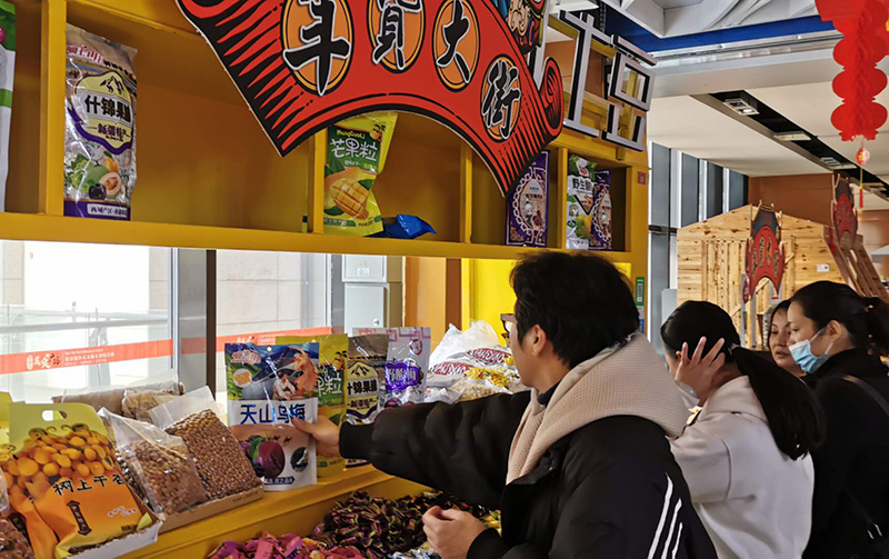 造型各異的花車擺滿品類豐富的年貨,有奶味濃郁的傳統(tǒng)手工酸奶,原汁原味的木壘原漿釀酒,口感細膩營養(yǎng)極高的鷹嘴豆粉,入味有嚼勁兒的牛肉干,吃一口自然的牛肉味滿口溢香。